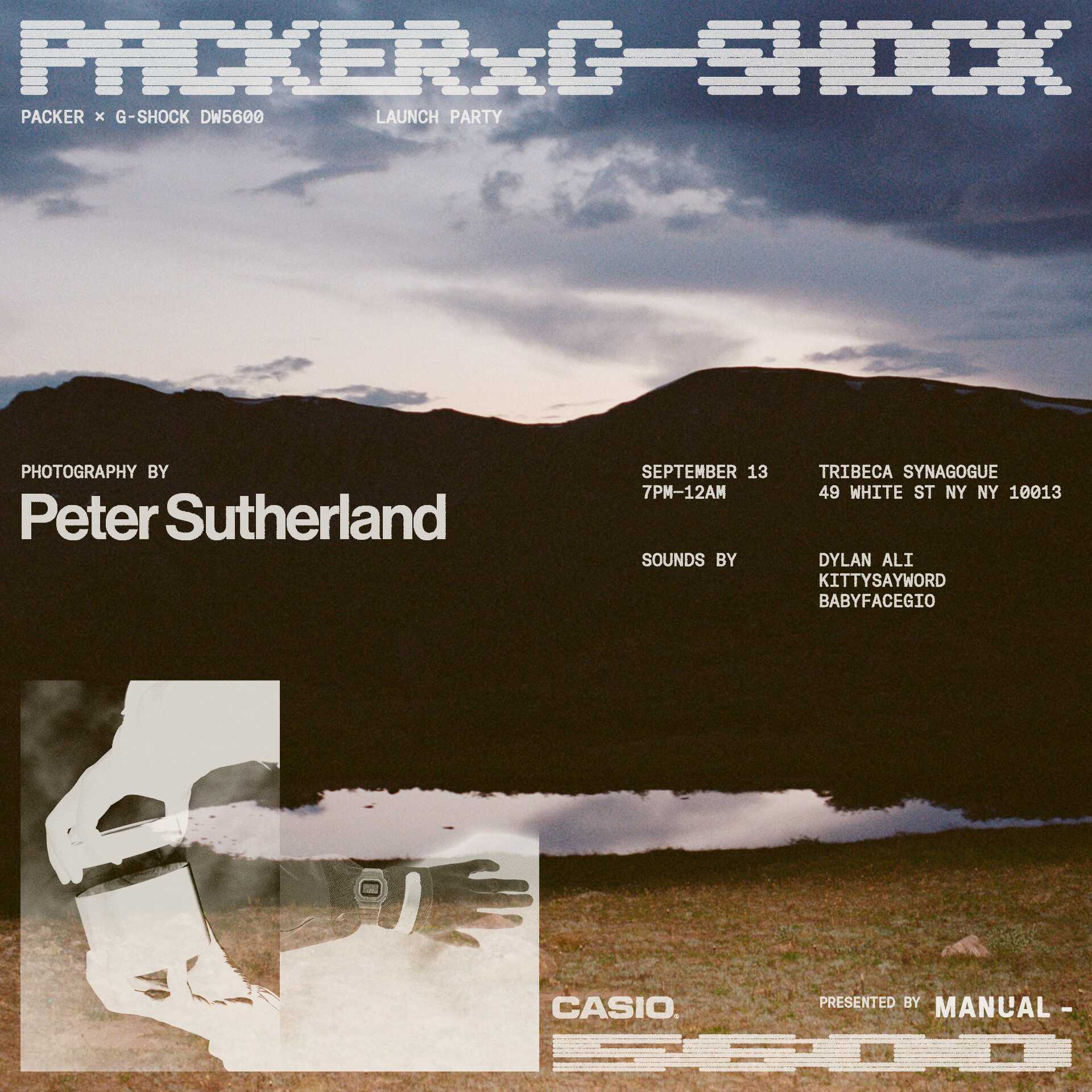 Custom type, flyer design and projection visuals for the Packer x G-Shock watch release party, featuring photography by Peter Sutherland.