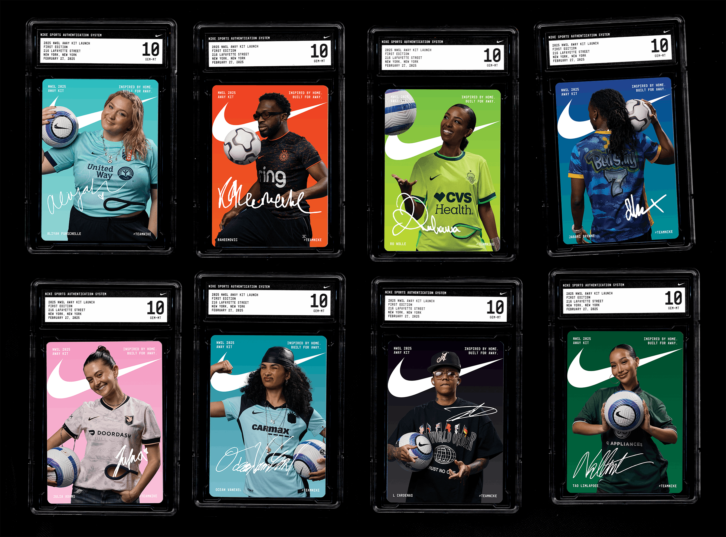 Trading card design for the National Women's Soccer League Away Kit Nike launch activation. Portrait photography by Raphaƫl Gaultier.