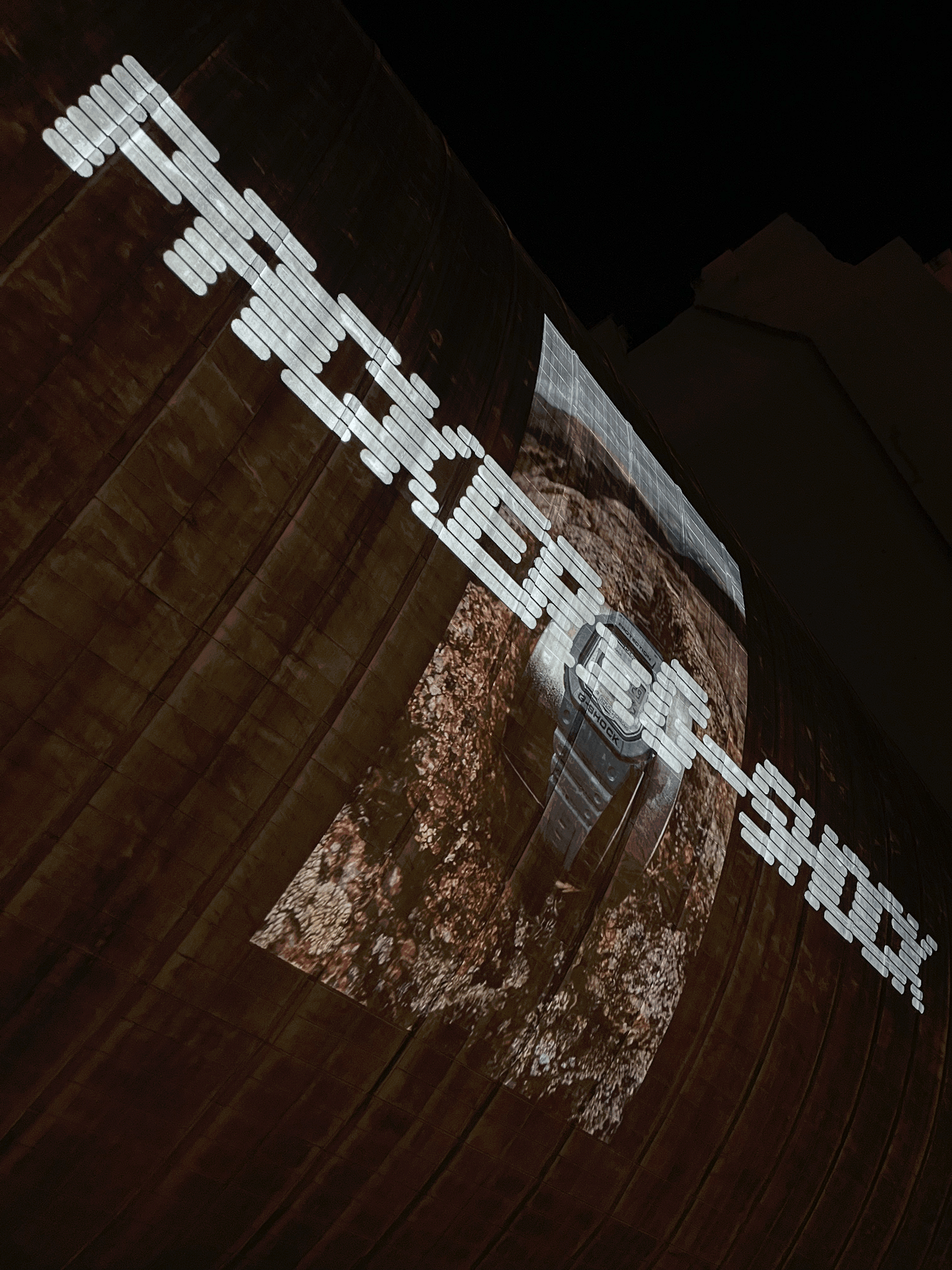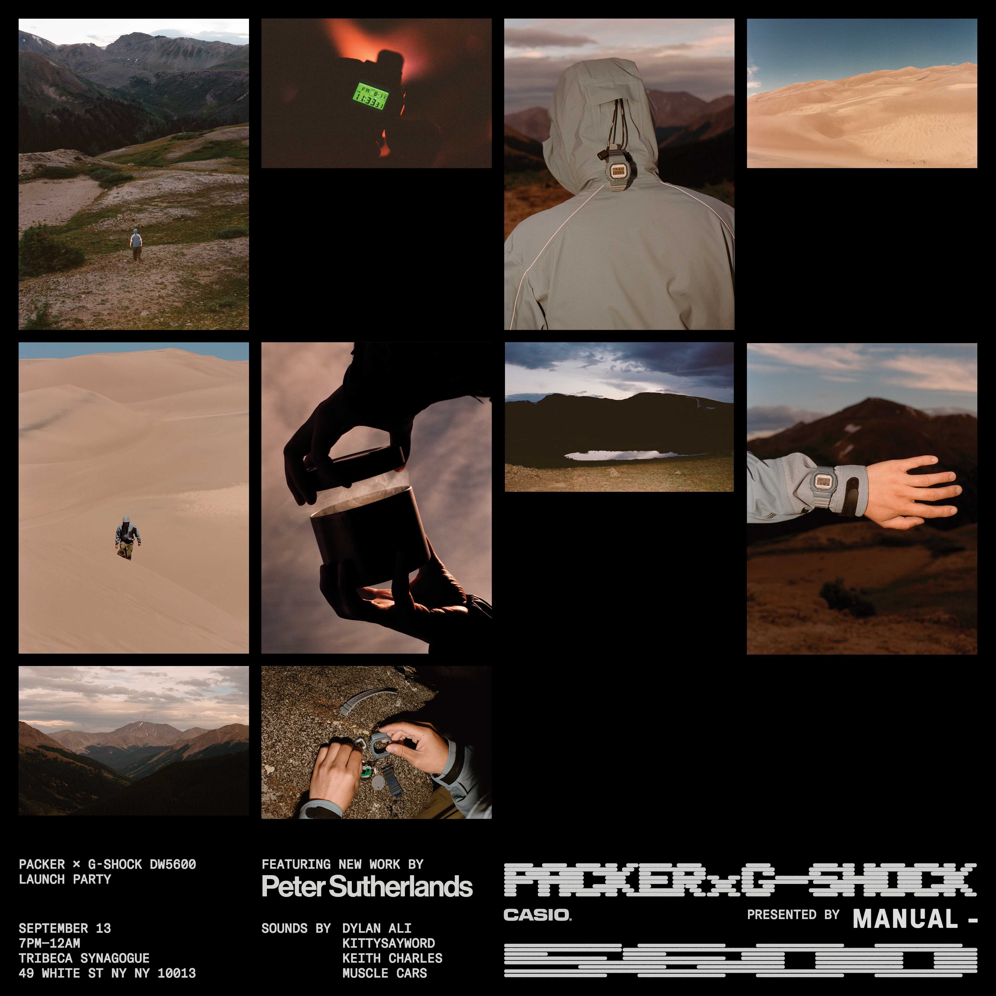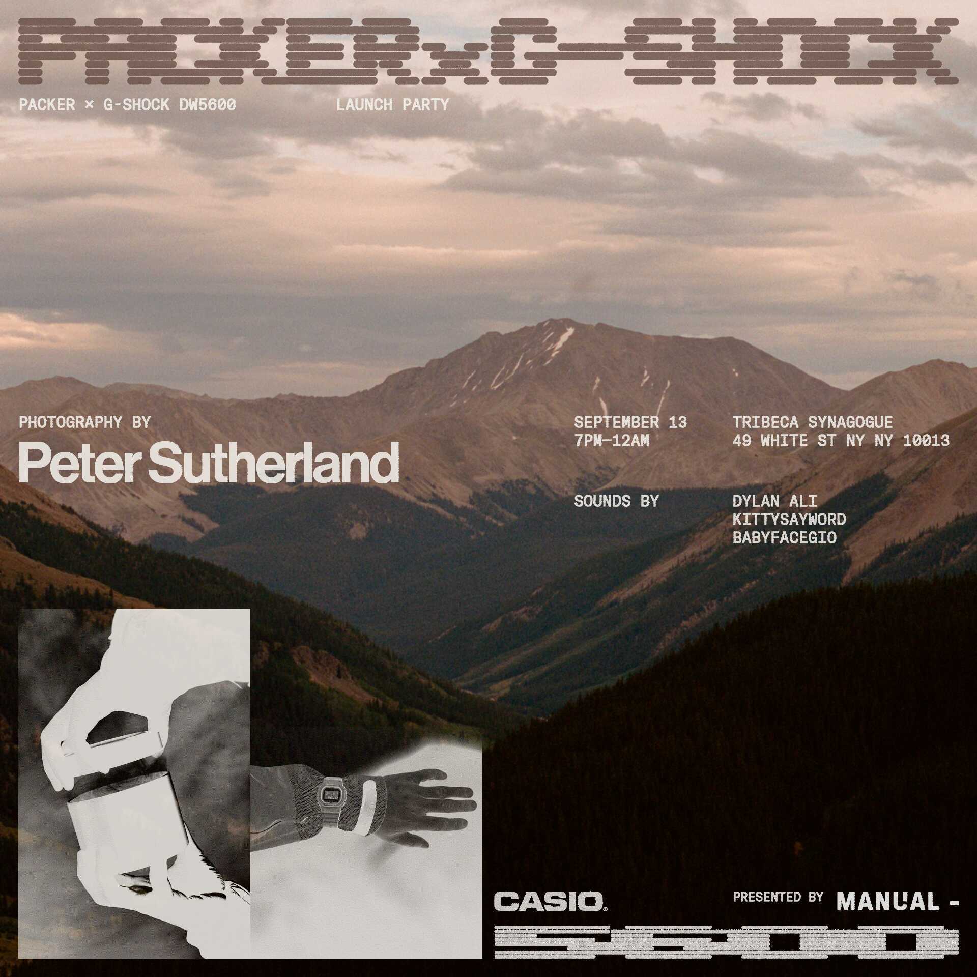 Custom type, flyer design and projection visuals for the Packer x G-Shock watch release party, featuring photography by Peter Sutherland.